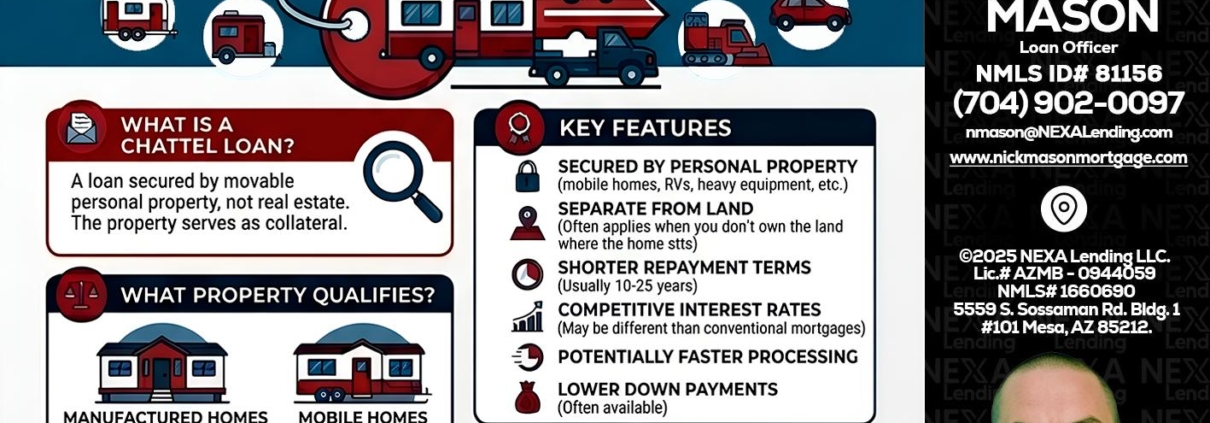 Chattel Loans - Nick Mason -Loan OfficerHi, my name is Nick Mason. I’m a Loan Officer offering personalized mortgage solutions, fast customized quotes, great rates and service with integrity. If you’re interested in learning more about the Chattel loan or any other, just let me know and I’ll walk you through your options.