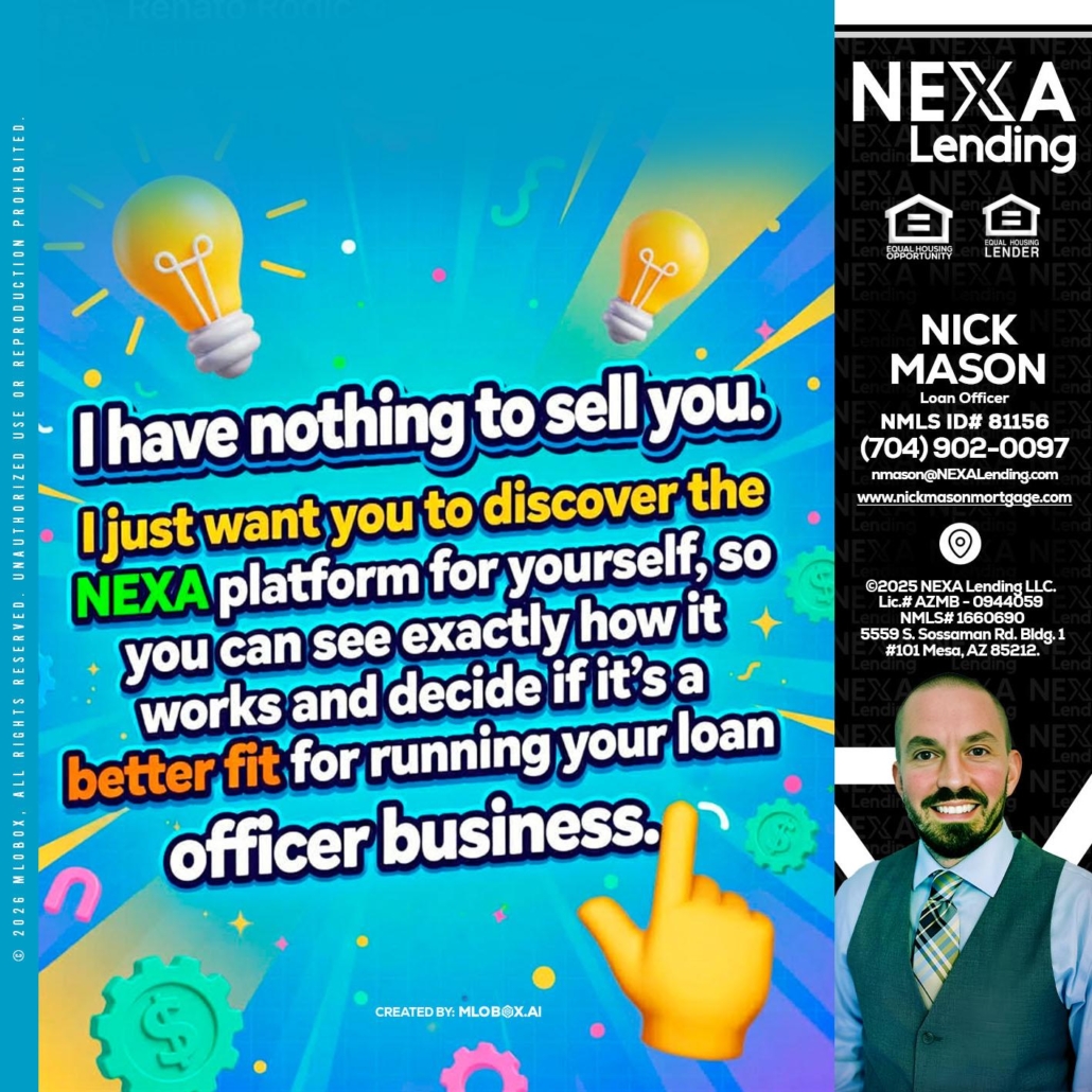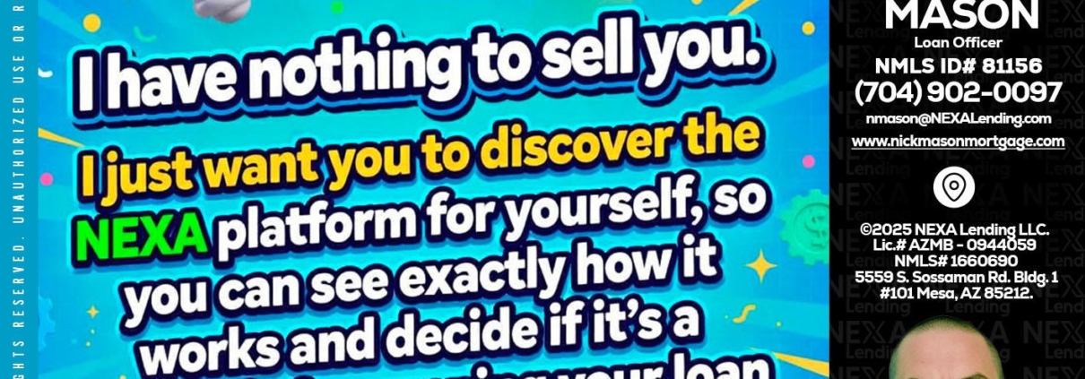 Hi, my name is Nick Mason. I’m a Loan Officer with NEXA Lending LLC., offering personalized mortgage solutions, fast customized quotes, great rates and service with integrity.