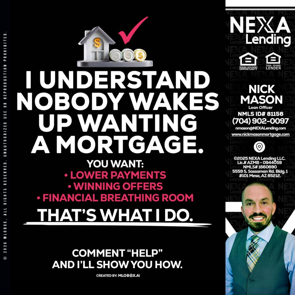 Hi, my name is Nick Mason. I’m a Loan Officer with NEXA Lending LLC., offering personalized mortgage solutions, fast customized quotes, great rates and service with integrity.