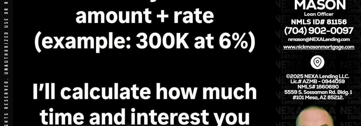 Hi, my name is Nick Mason. I’m a Loan Officer with NEXA Lending LLC., offering personalized mortgage solutions, fast customized quotes, great rates and service with integrity.