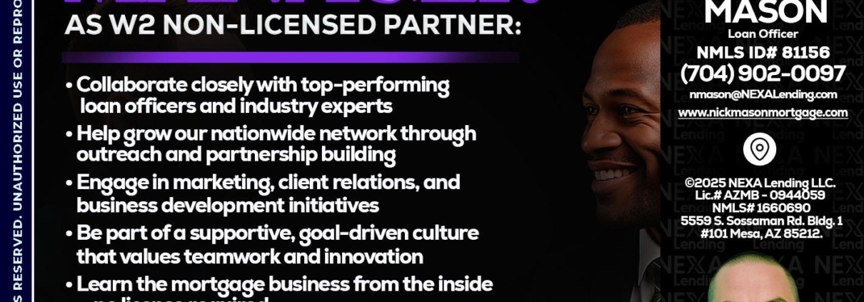 NOW HIRING - Nick Mason -Loan OfficerHi, my name is Nick Mason. I’m a Loan Officer with NEXA Mortgage LLC., offering personalized mortgage solutions, fast customized quotes, great rates and service with integrity.