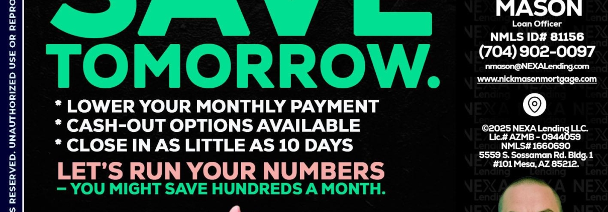 Hi, my name is Nick Mason. I’m a Loan Officer with NEXA Mortgage LLC., offering personalized mortgage solutions, fast customized quotes, great rates and service with integrity.