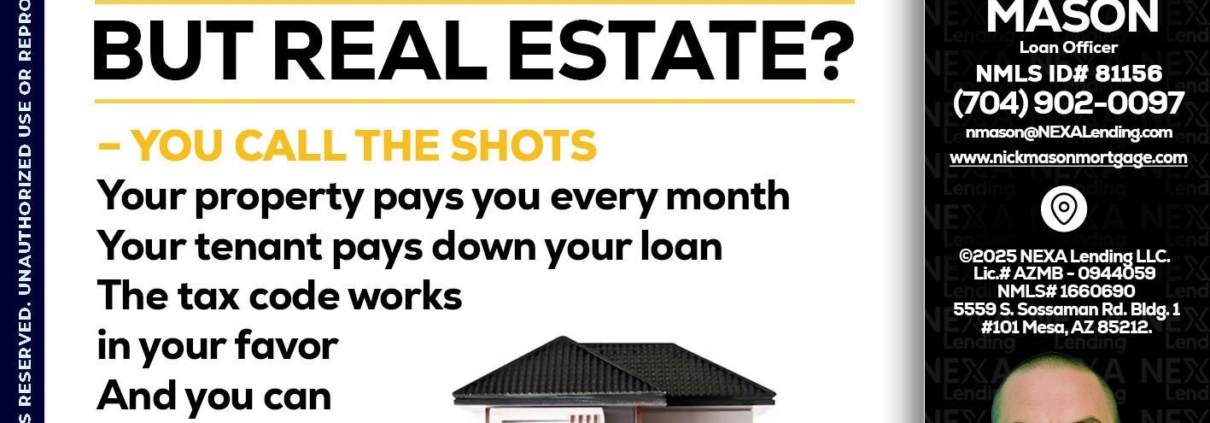 Hi, my name is Nick Mason. I’m a Loan Officer with NEXA Mortgage LLC., offering personalized mortgage solutions, fast customized quotes, great rates and service with integrity.
