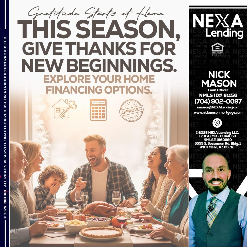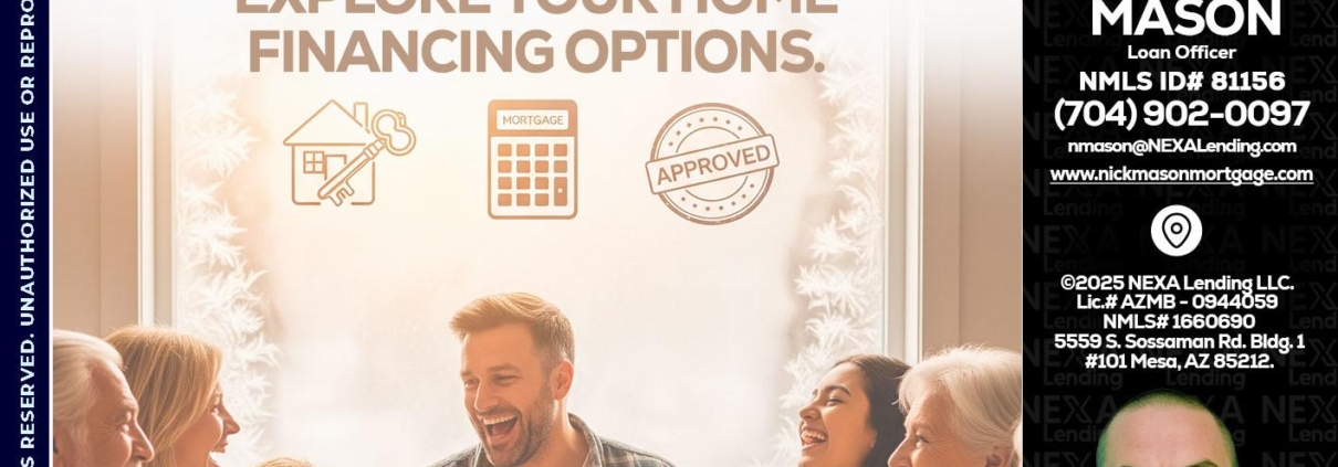 Hi, my name is Nick Mason. I’m a Loan Officer with NEXA Mortgage LLC., offering personalized mortgage solutions, fast customized quotes, great rates and service with integrity.