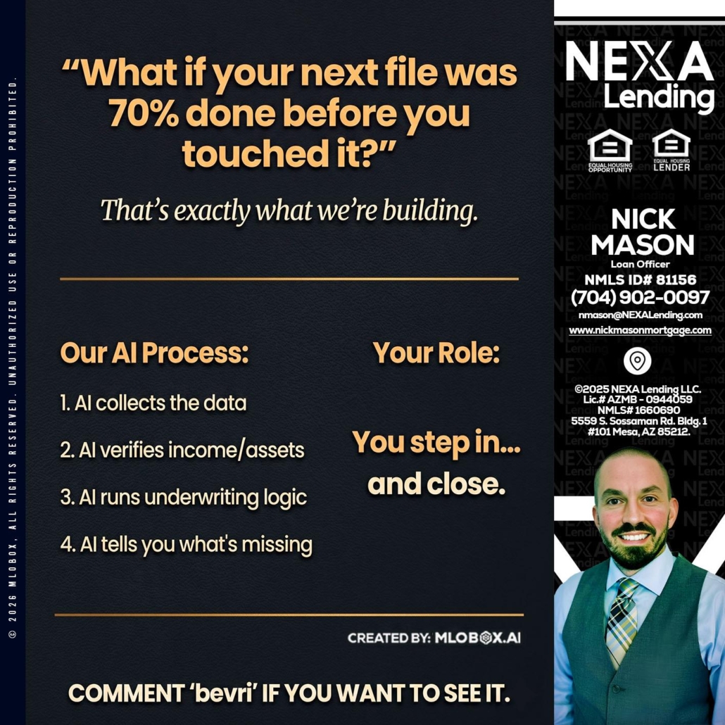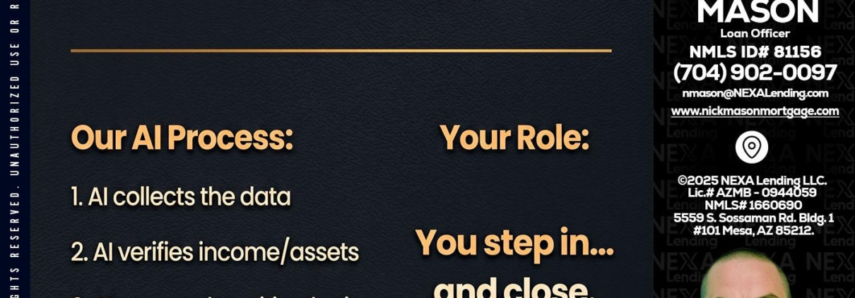 Hi, my name is Nick Mason. I’m a Loan Officer with NEXA Lending LLC., offering personalized mortgage solutions, fast customized quotes, great rates and service with integrity.