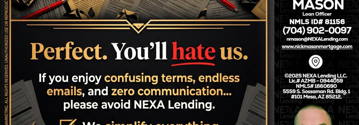 Hi, my name is Nick Mason. I’m a Loan Officer with NEXA Lending LLC., offering personalized mortgage solutions, fast customized quotes, great rates and service with integrity.