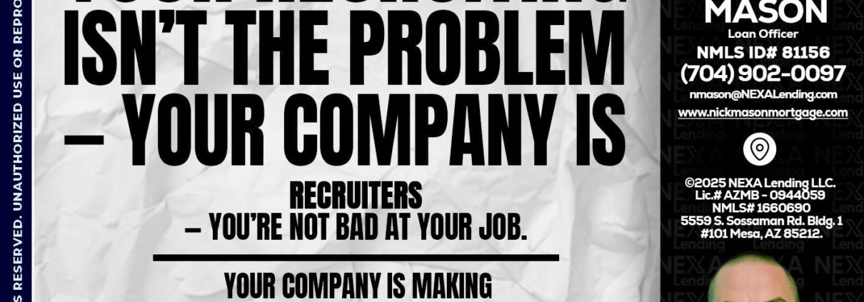 Hi, my name is Nick Mason. I’m a Loan Officer with NEXA Mortgage LLC., offering personalized mortgage solutions, fast customized quotes, great rates and service with integrity.